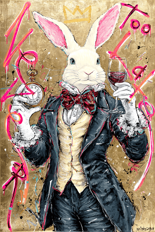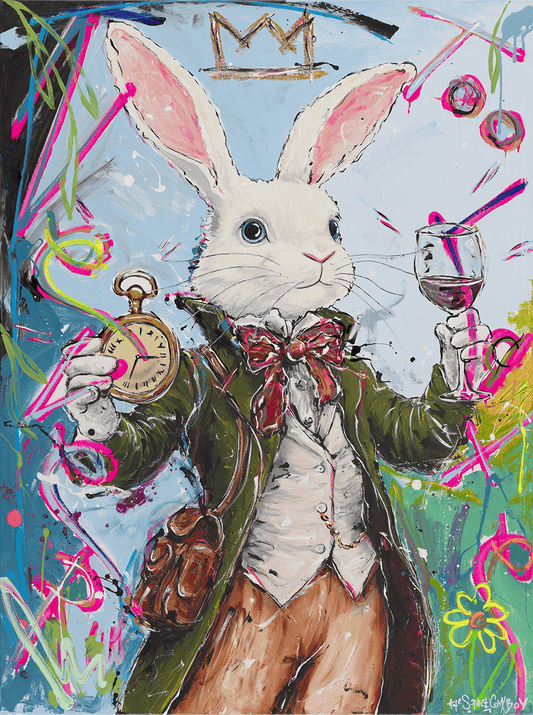 Acrylic paint, paint pen, and spray paint on gallery wrapped canvas. Ready to hang.