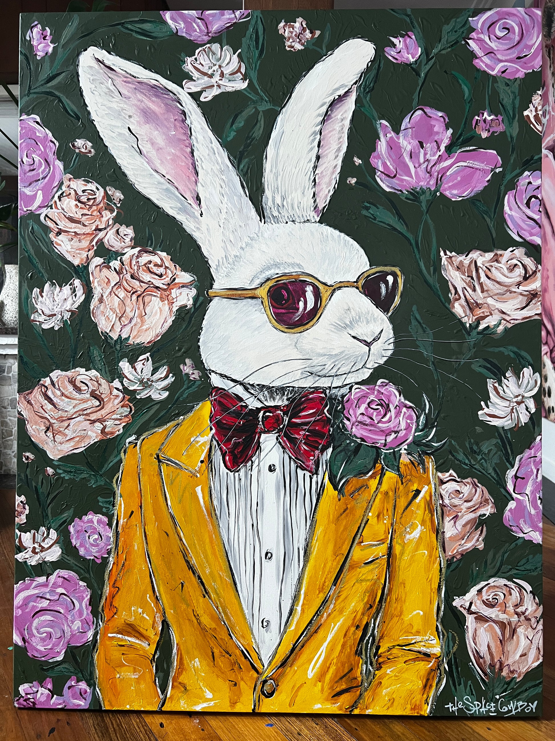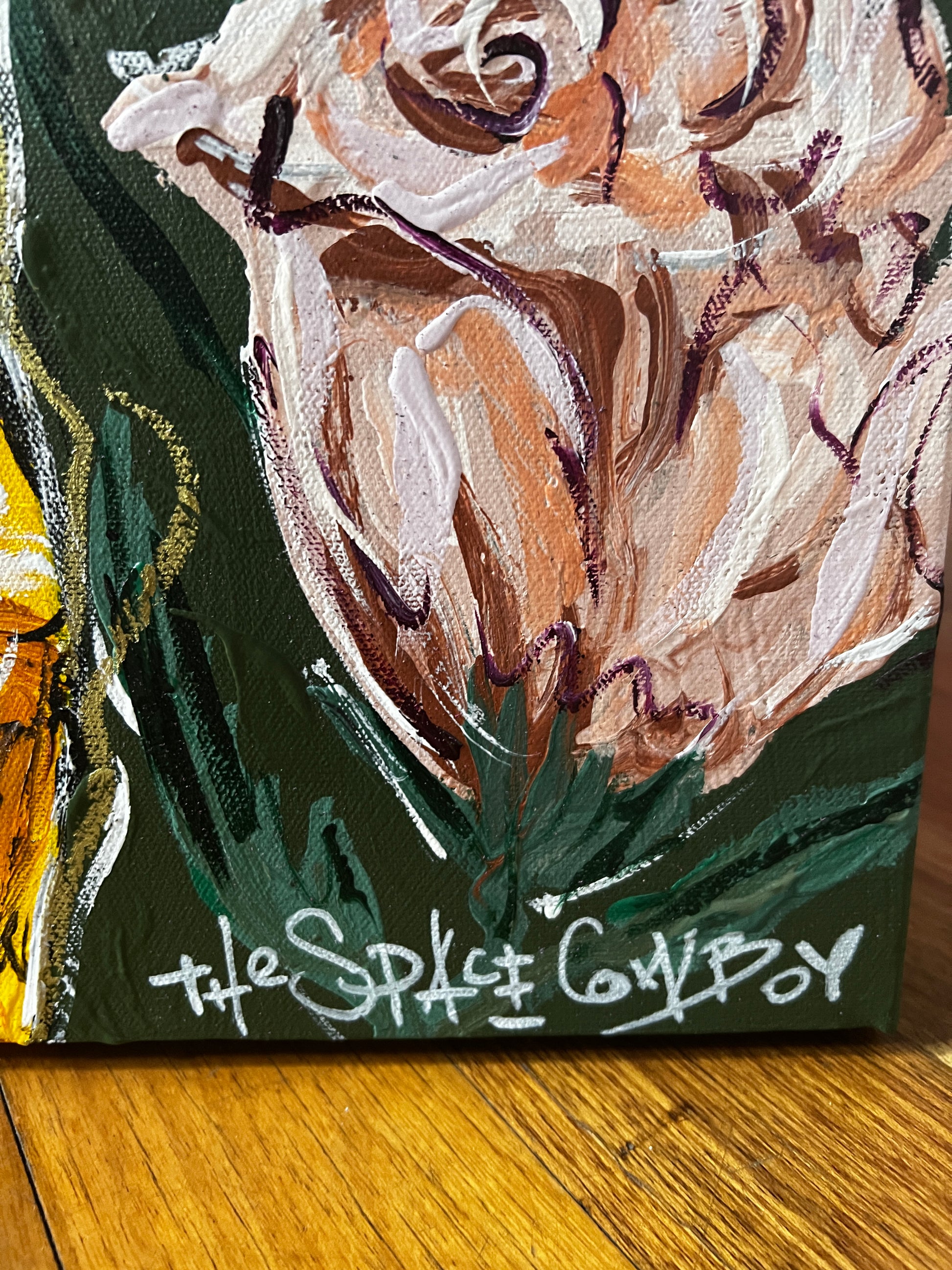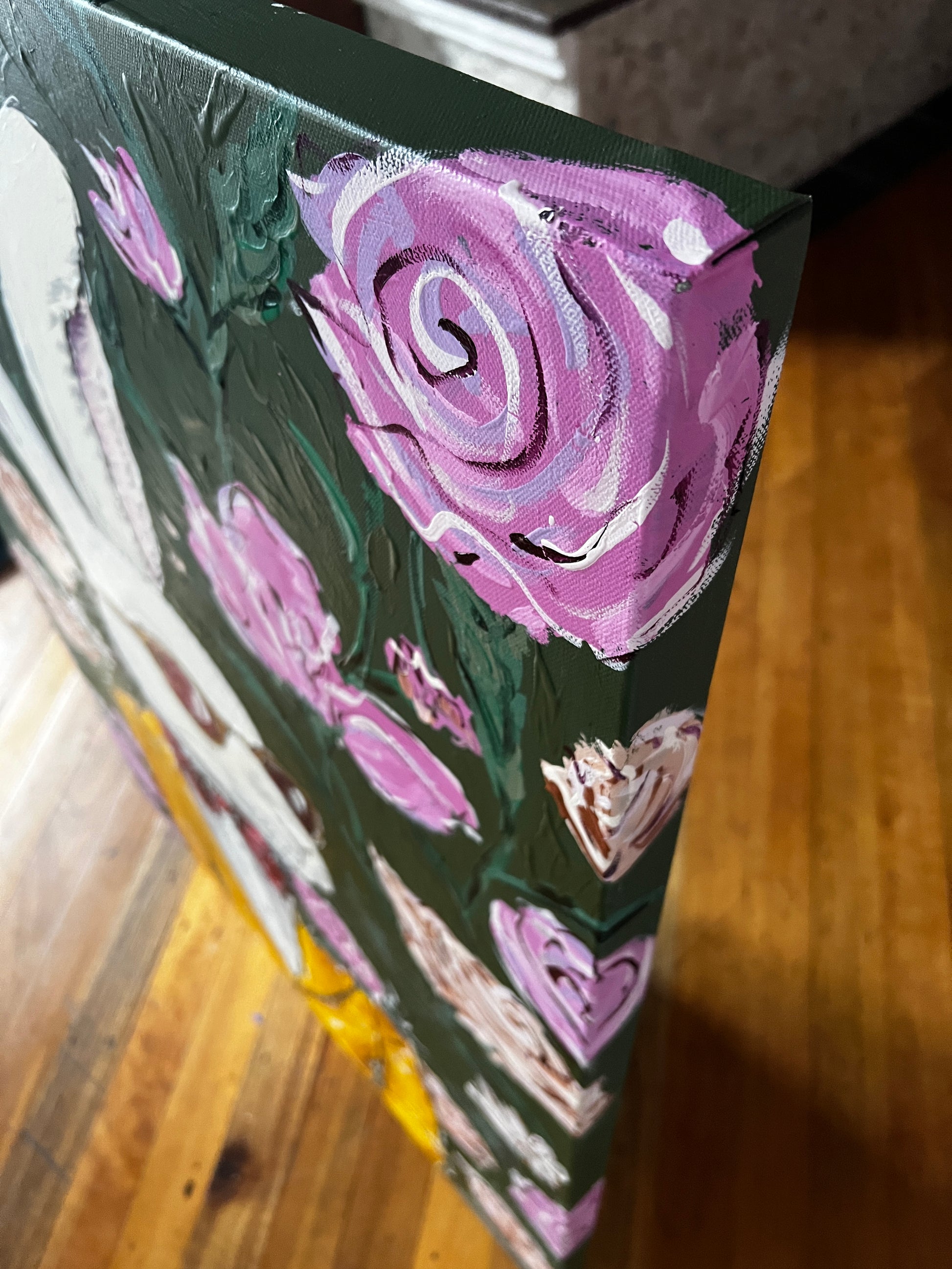 Acrylic paint, paint pen, and spray paint on gallery wrapped canvas. Ready to hang.