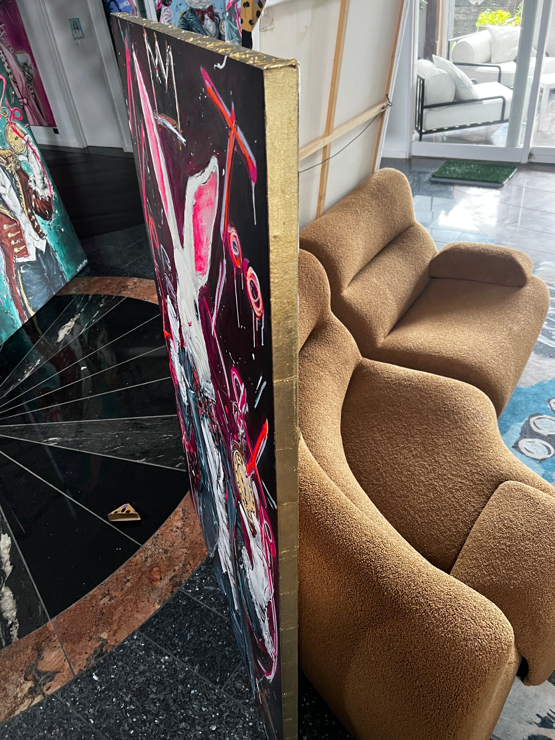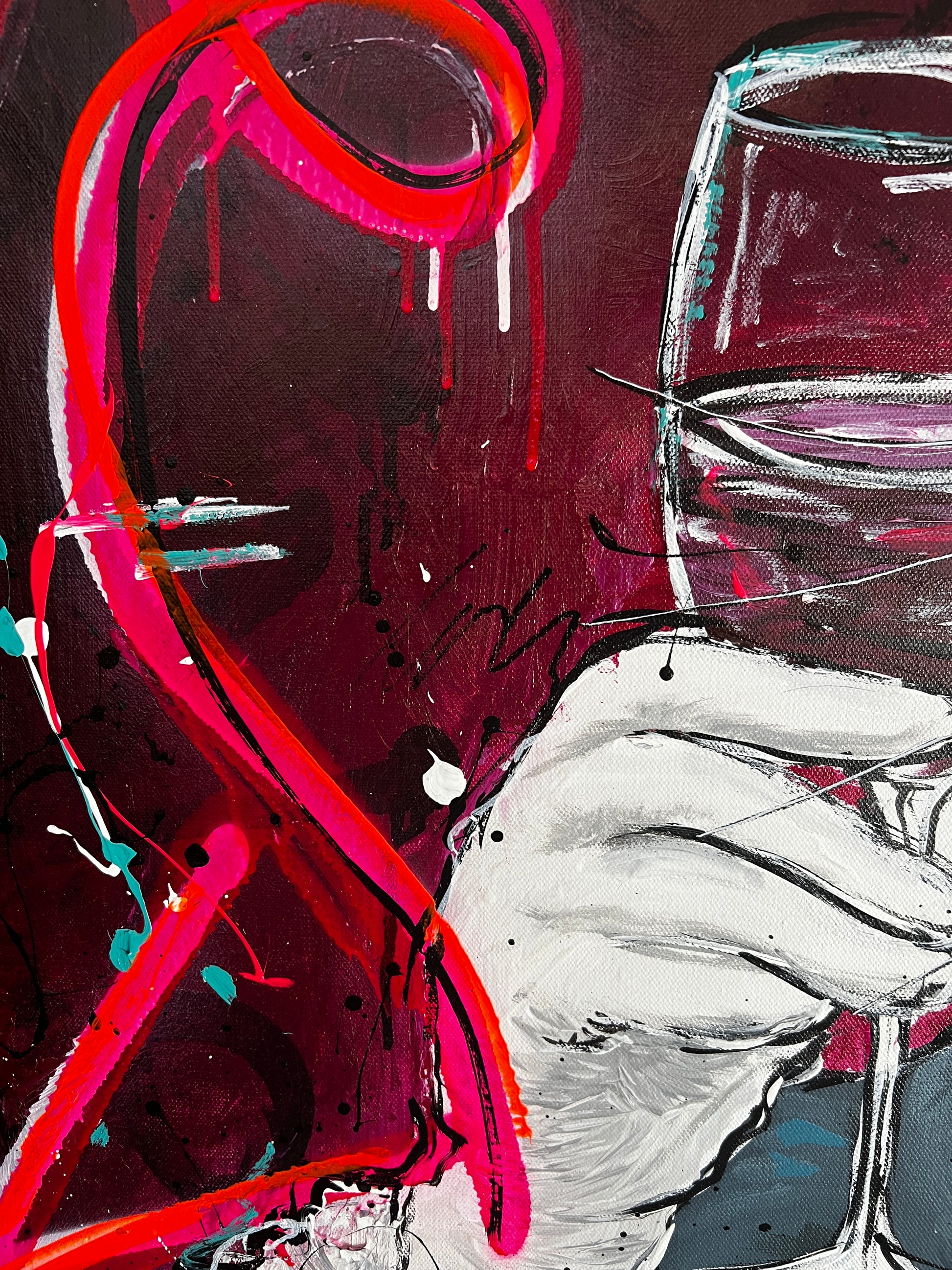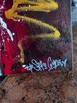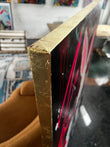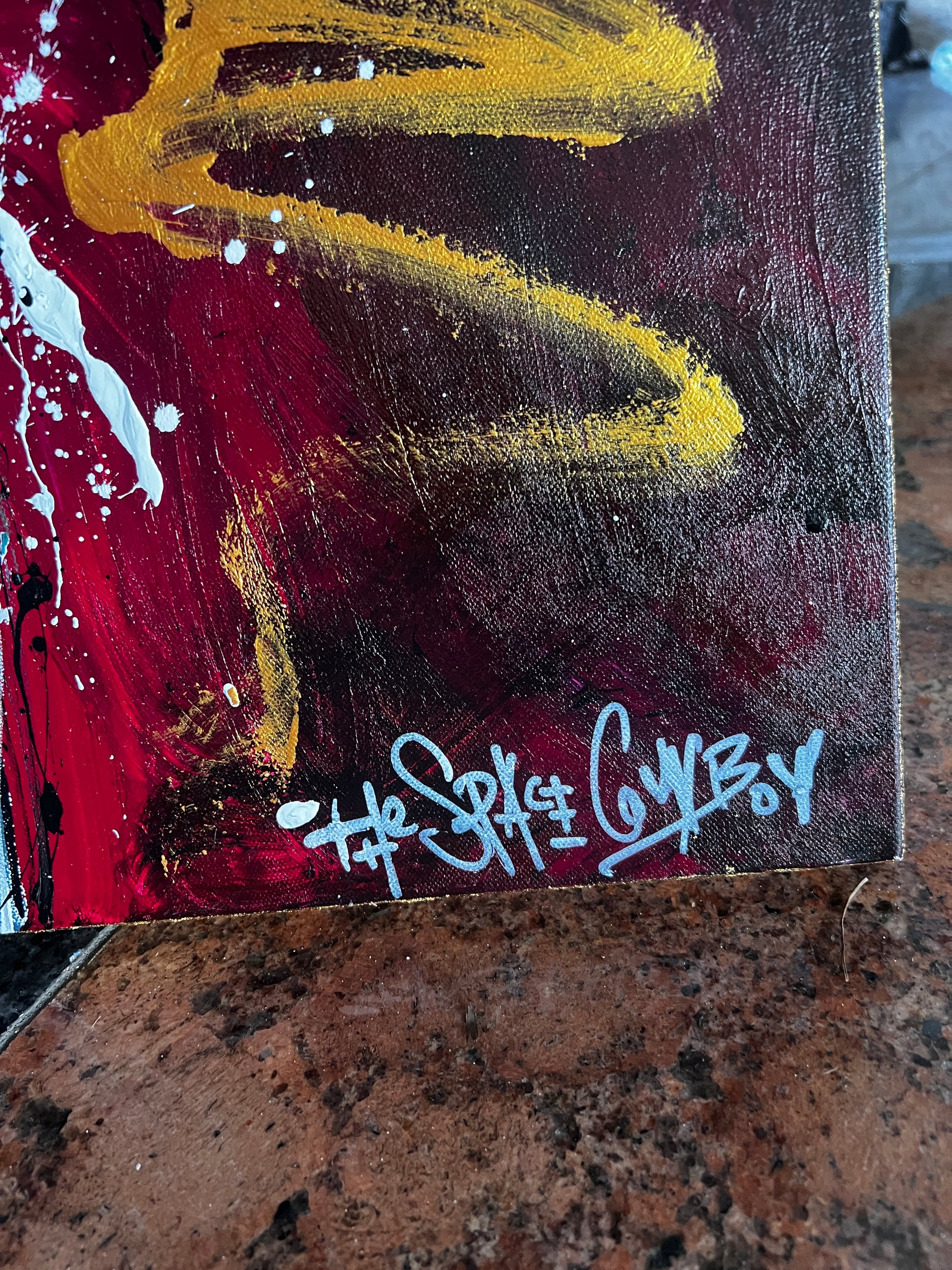 Acrylic paint, paint pen, and spray paint on gallery wrapped canvas. Ready to hang.