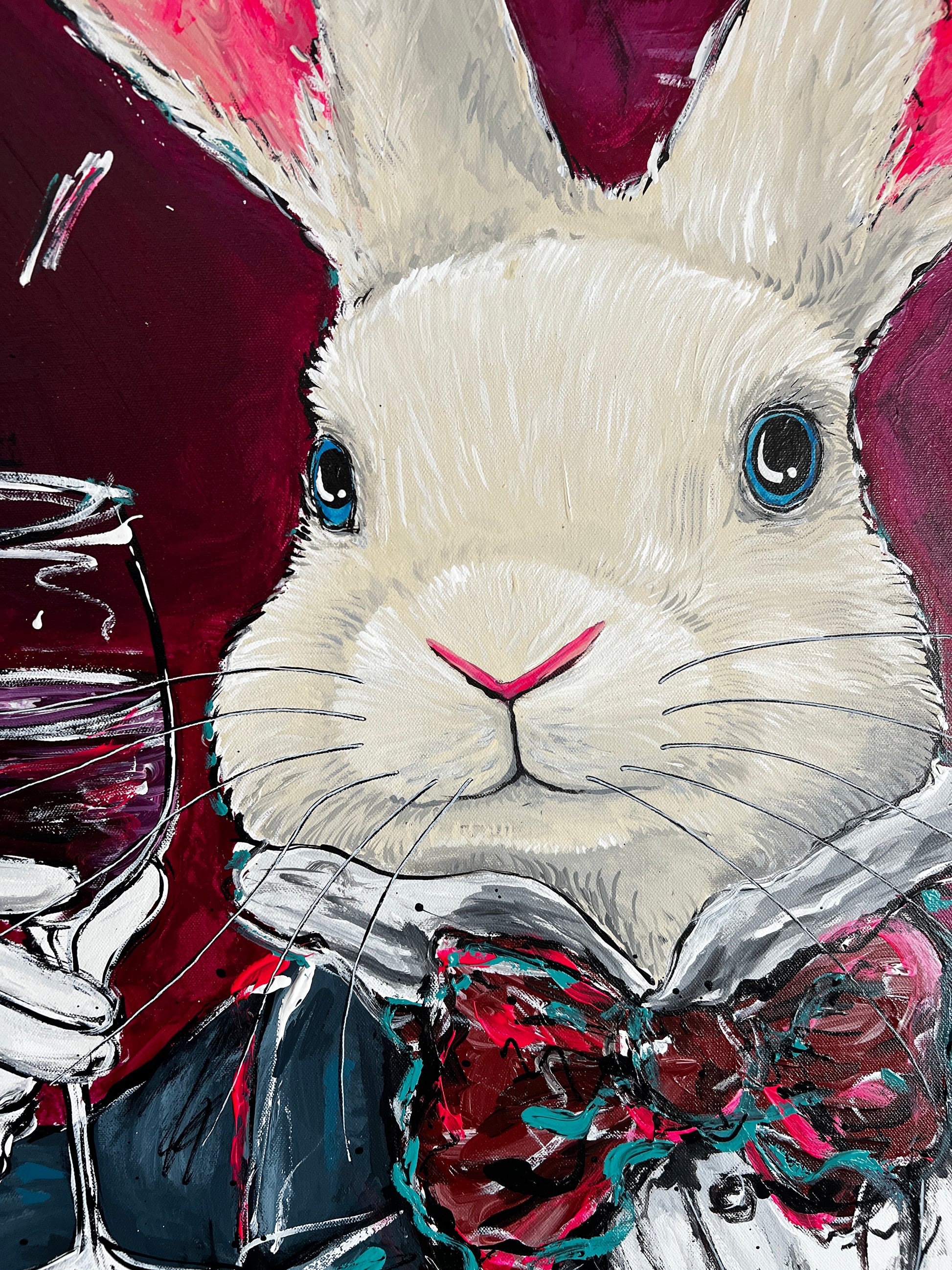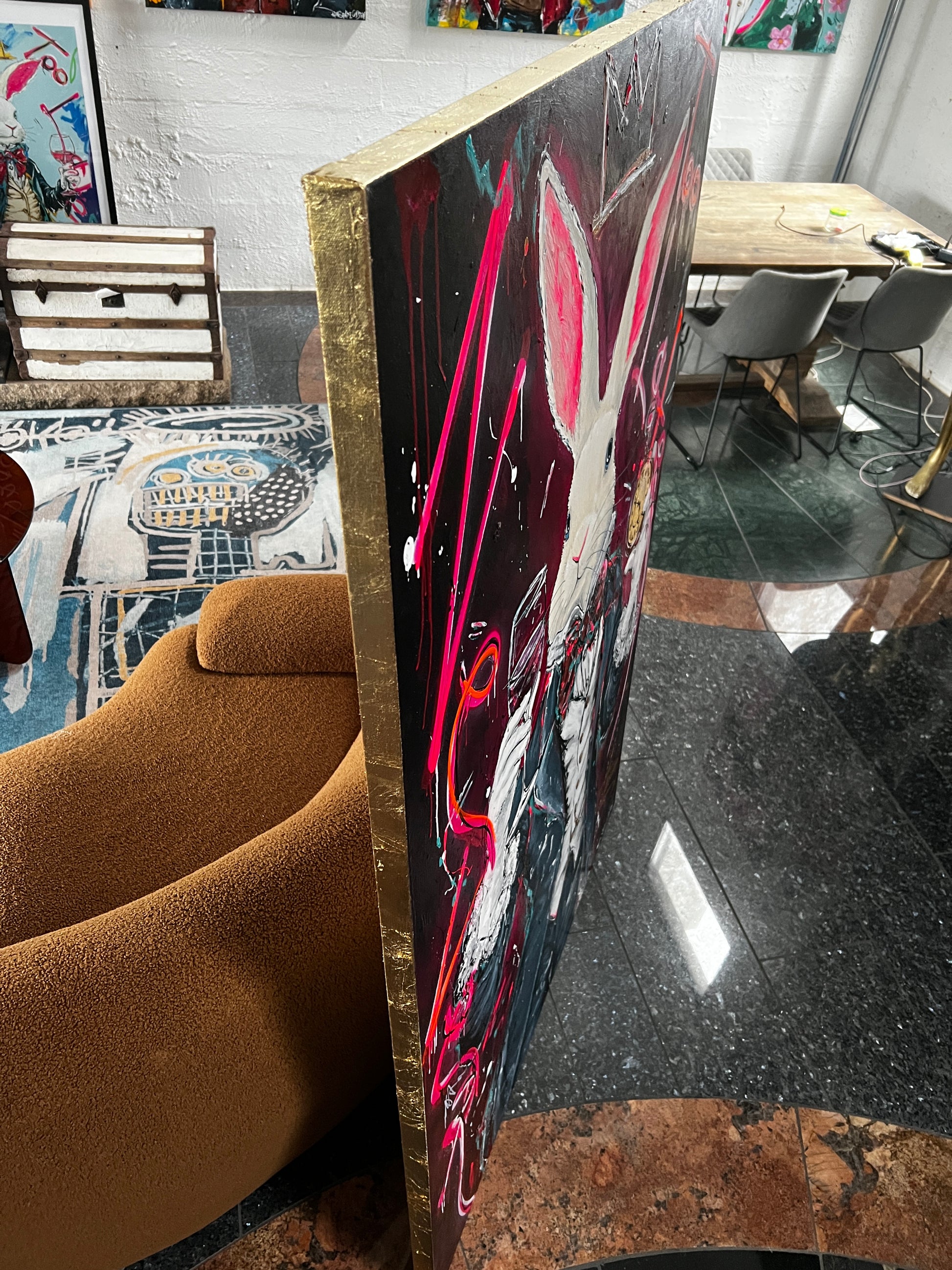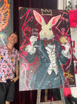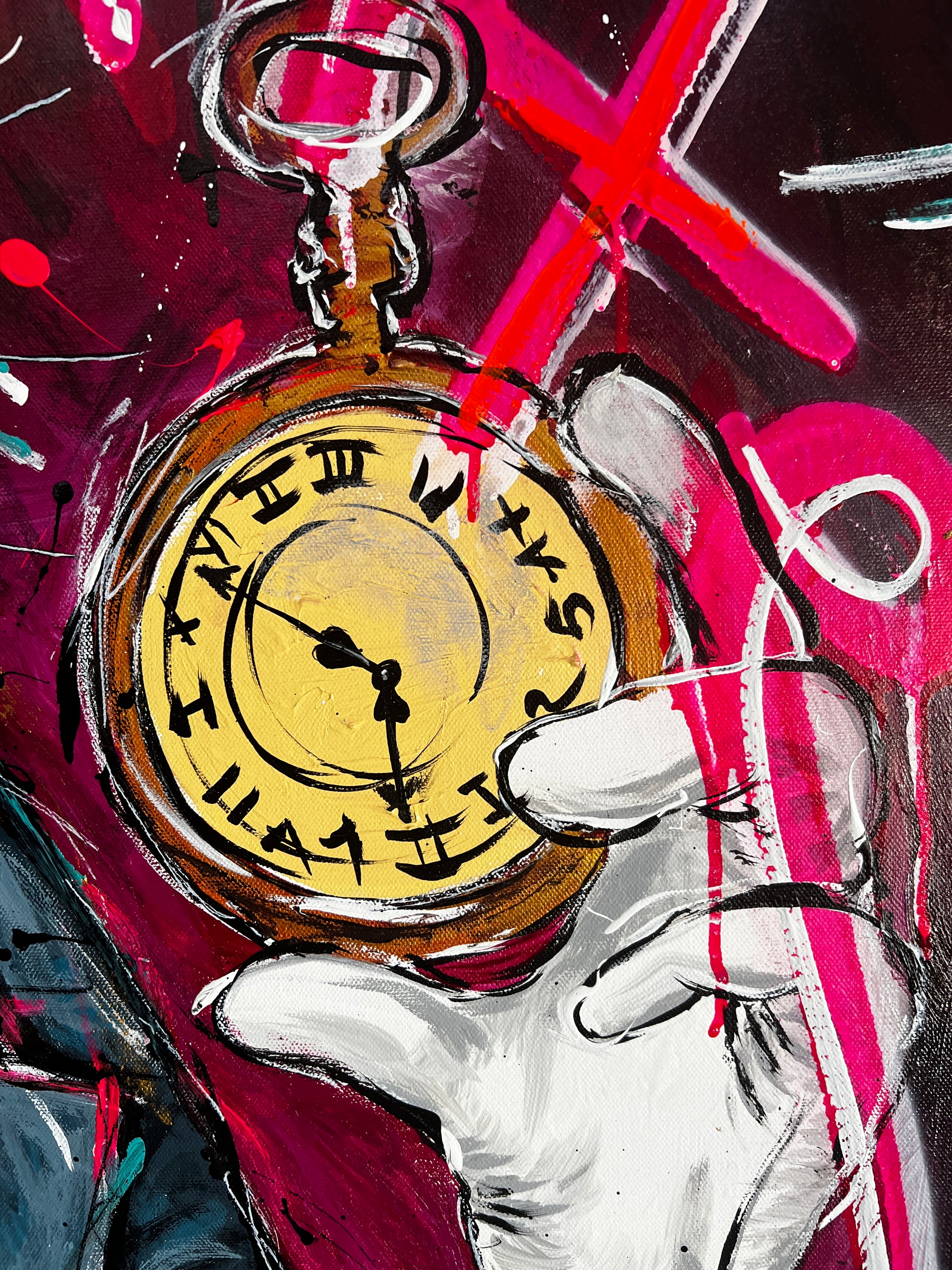 Acrylic paint, paint pen, and spray paint on gallery wrapped canvas. Ready to hang.