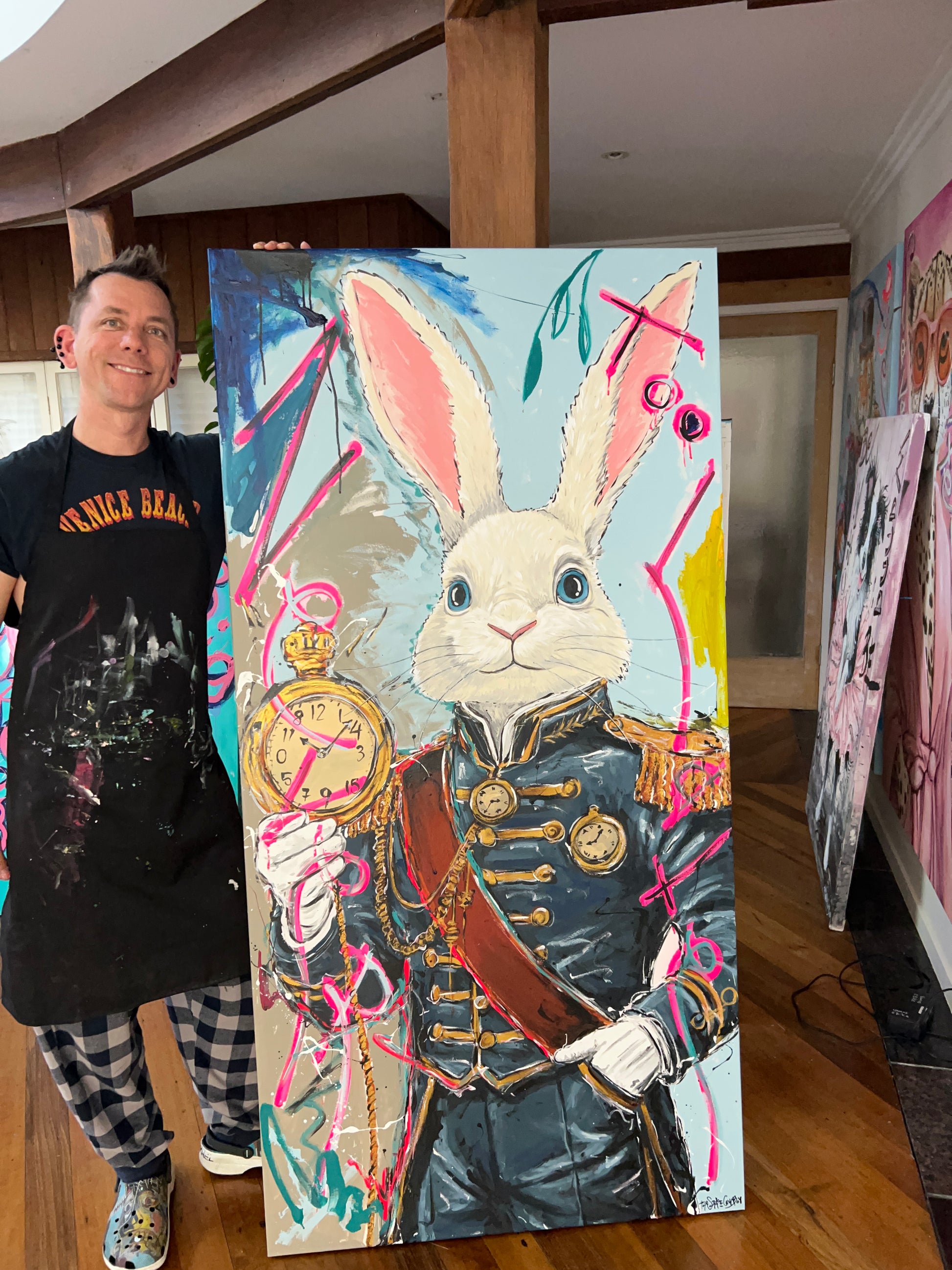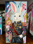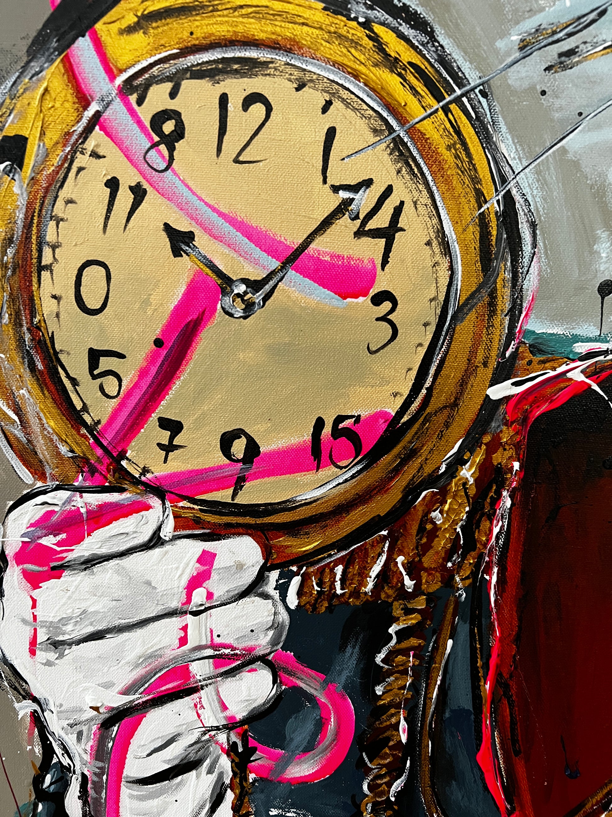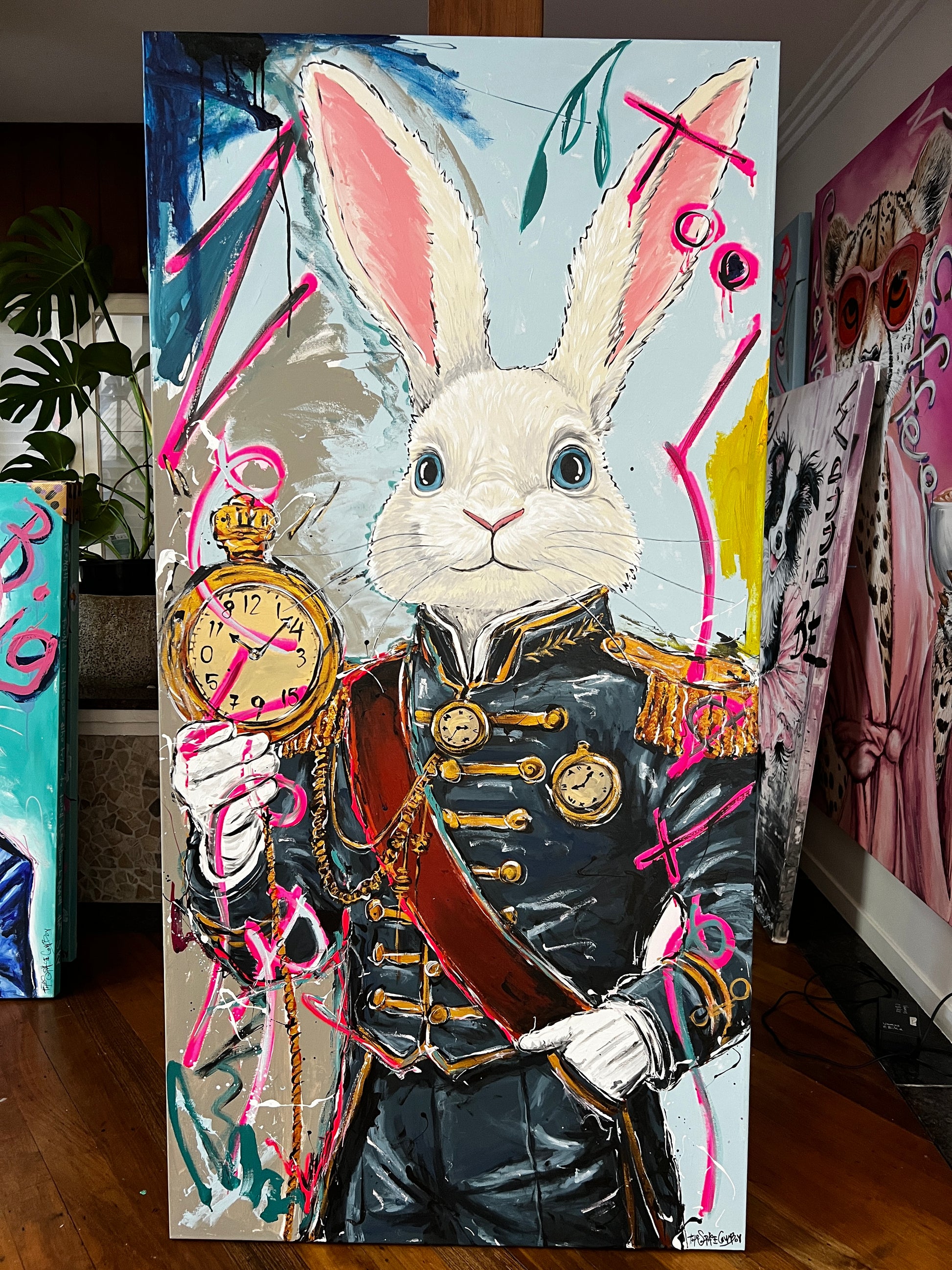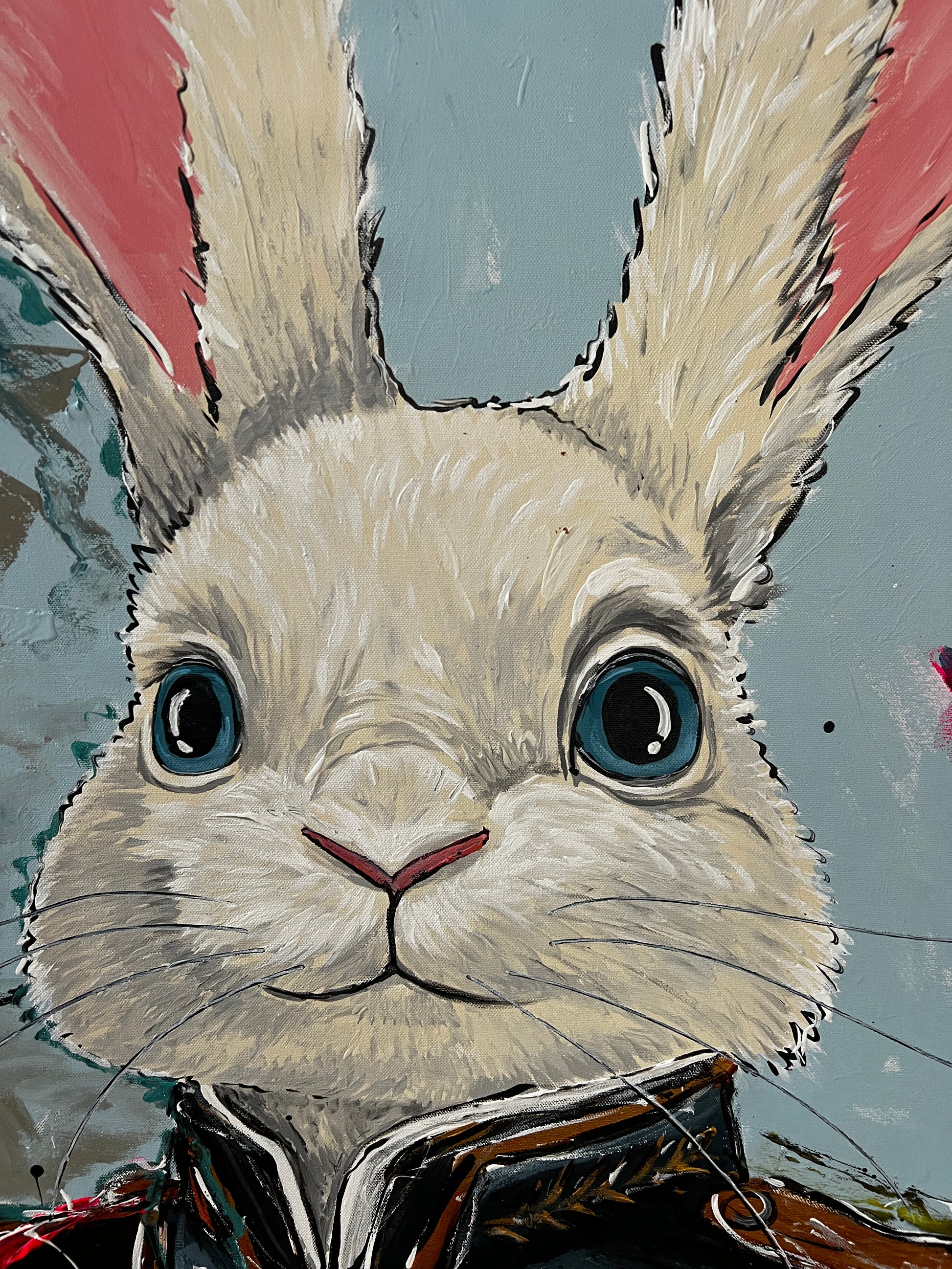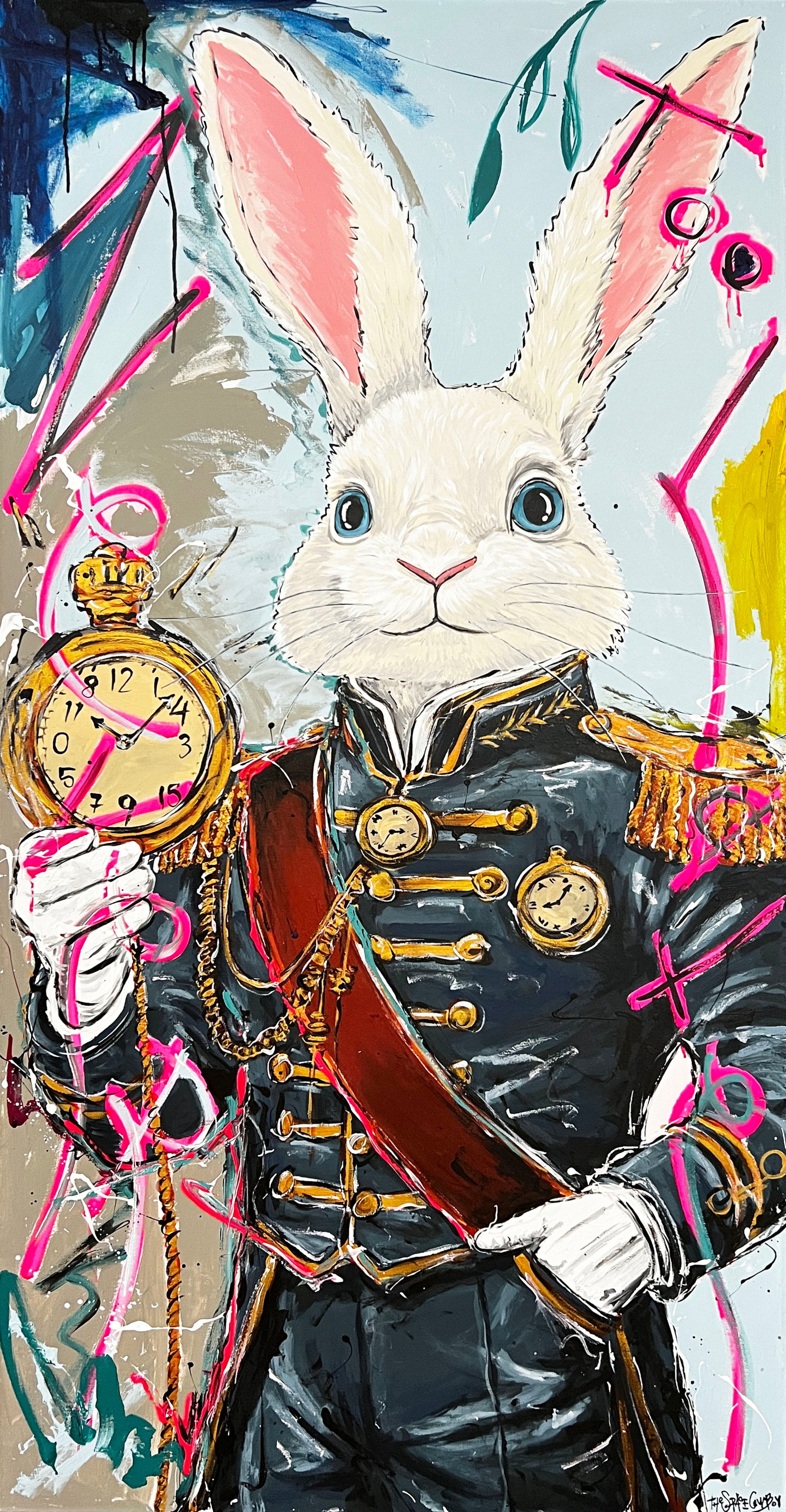 Acrylic paint, paint pen, and spray paint on gallery wrapped canvas. Ready to hang.